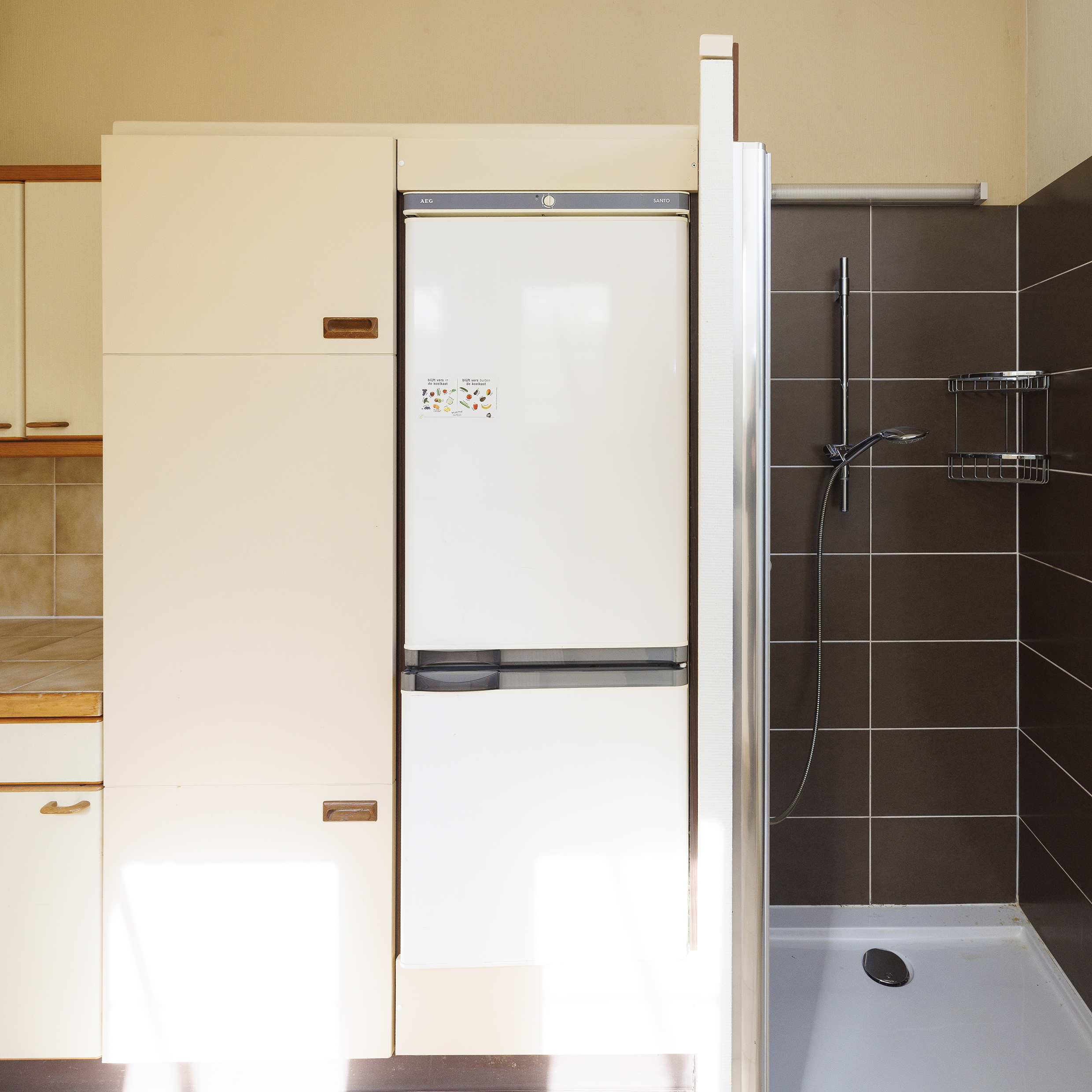 De ruime keuken is praktisch ingericht en voorzien van het meeste comfort, waaronder een vaatwasser, en sluit aan op een grote bergruimte (stookplaats) met douchecel en een apart toilet.