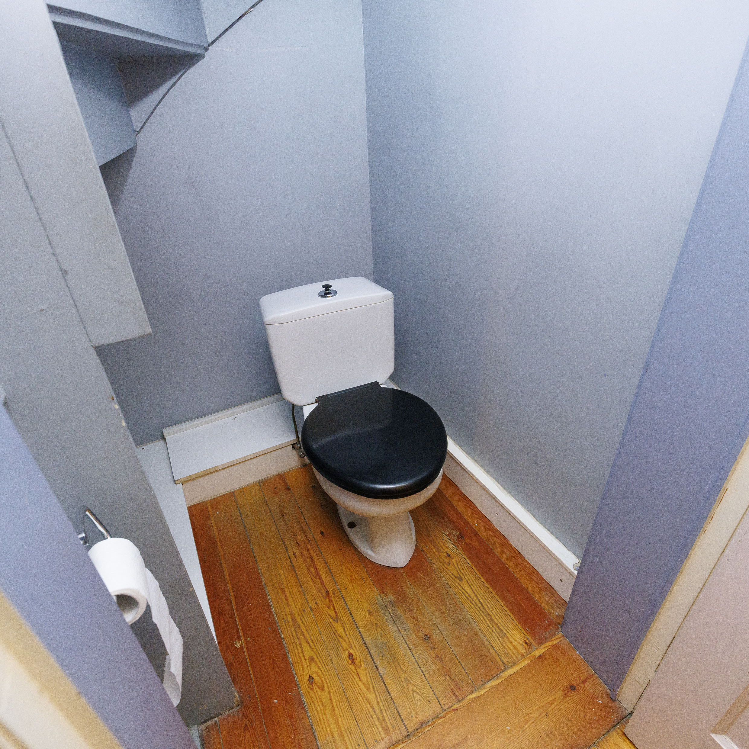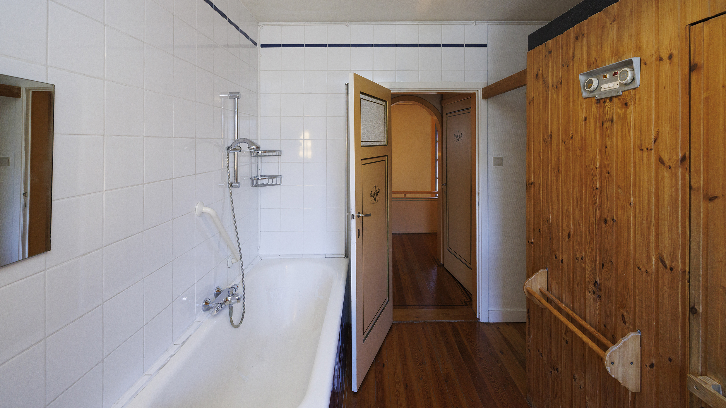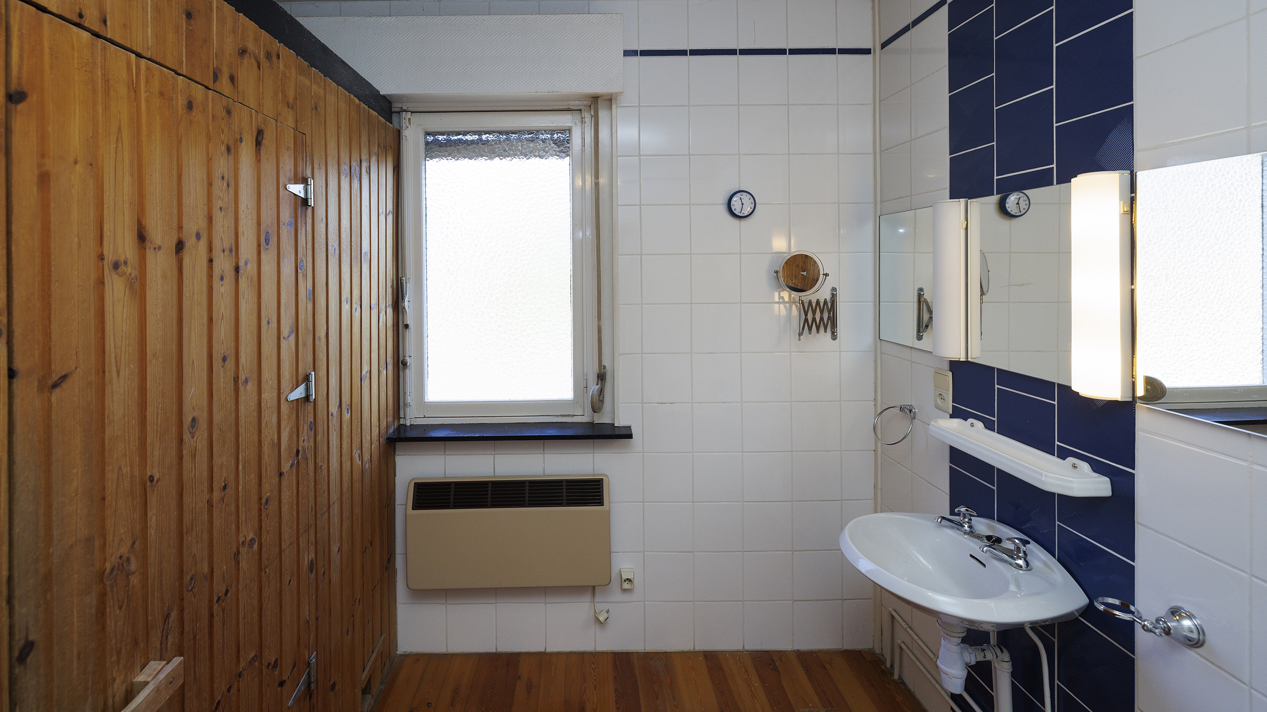 De brede houten trap leidt u naar de eerste verdieping met twee volwaardige en ruime slaapkamers. Daarnaast vindt u hier een badkamer met sauna, die u volledig naar eigen smaak kan renoveren, evenals een apart toilet.
