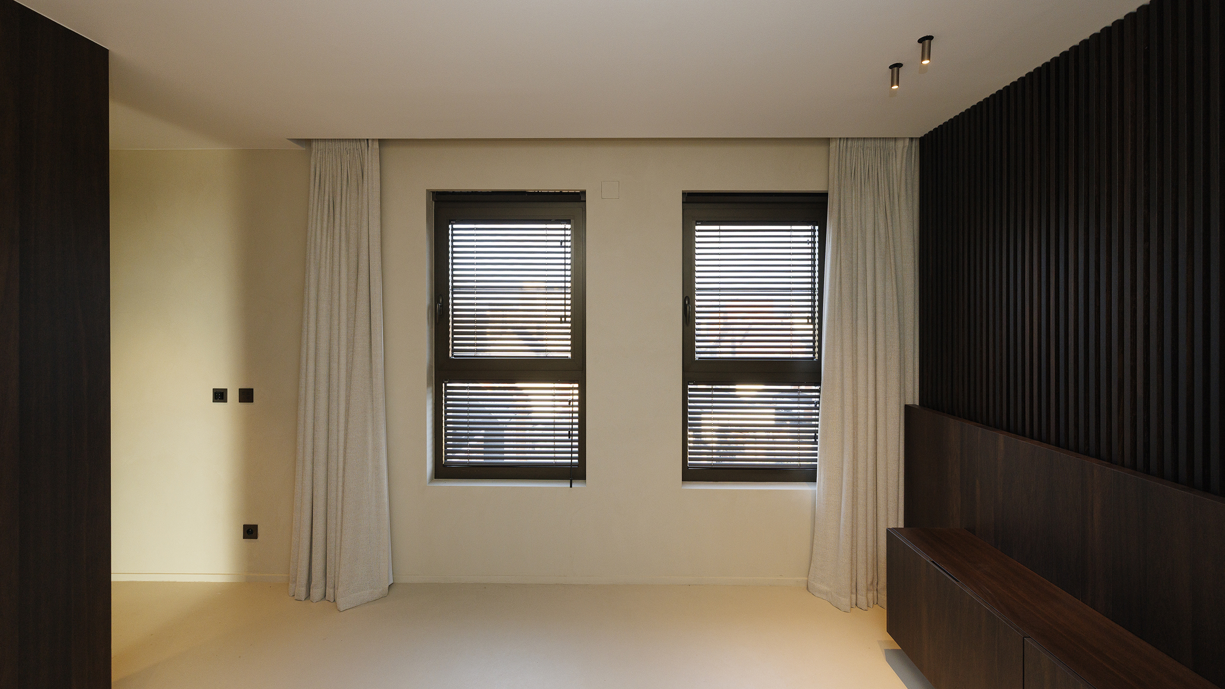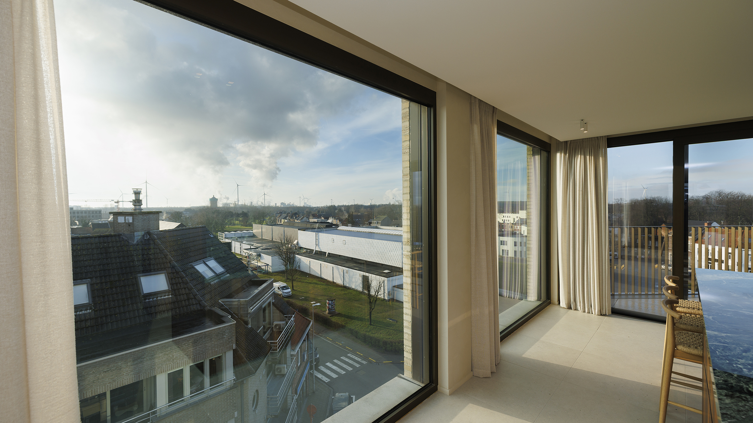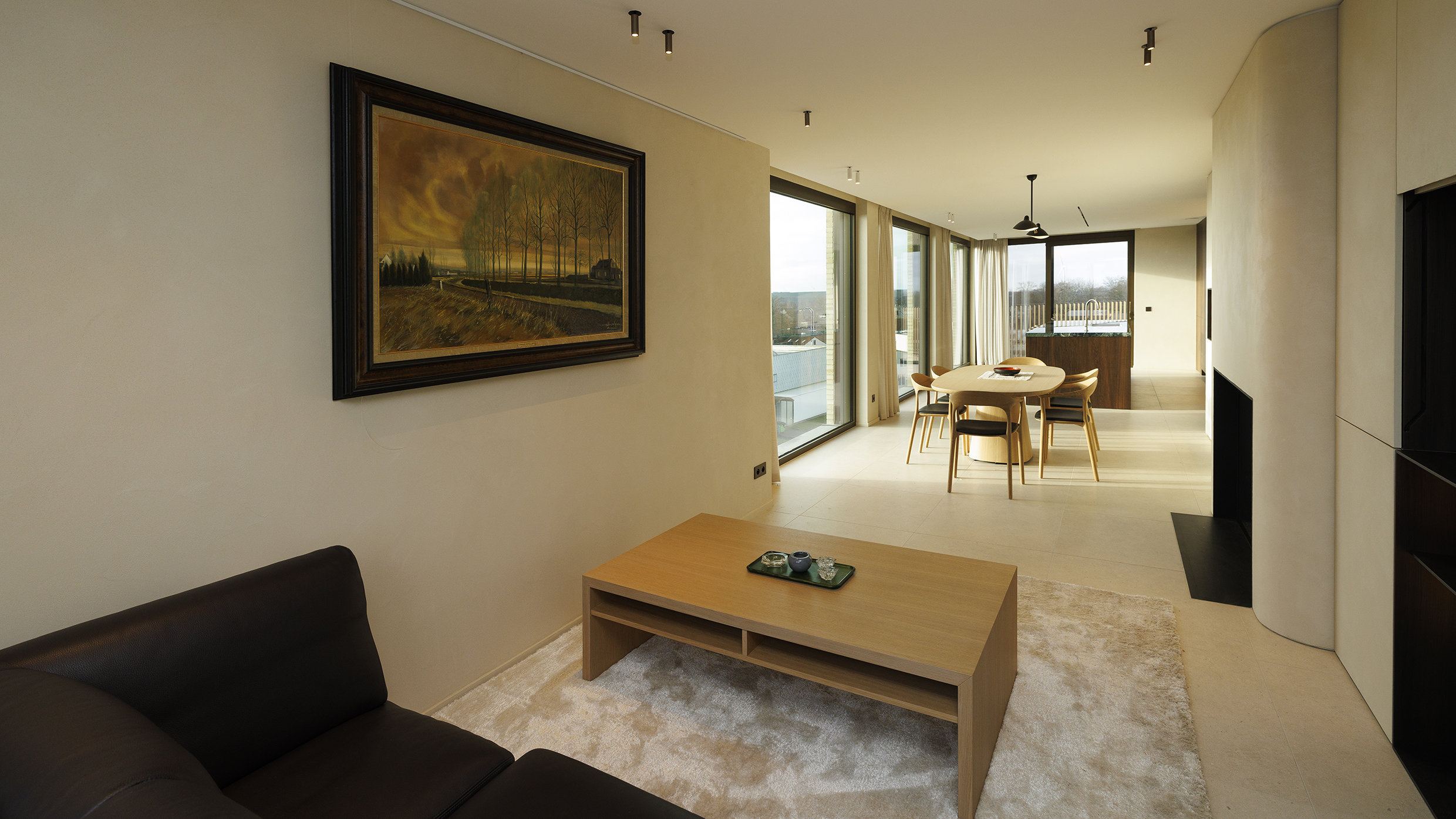 Bij het betreden van het appartement wordt u meteen verwelkomd in de lichtrijke woonkamer, waar ruimte en rust centraal staan. De grote raampartijen, de elegant geïntegreerde houten maatkasten en de design gashaard creëren een warme en verfijnde sfeer. Dankzij de automatische gordijnen met screens geniet u op elk moment van optimaal comfort en privacy.
