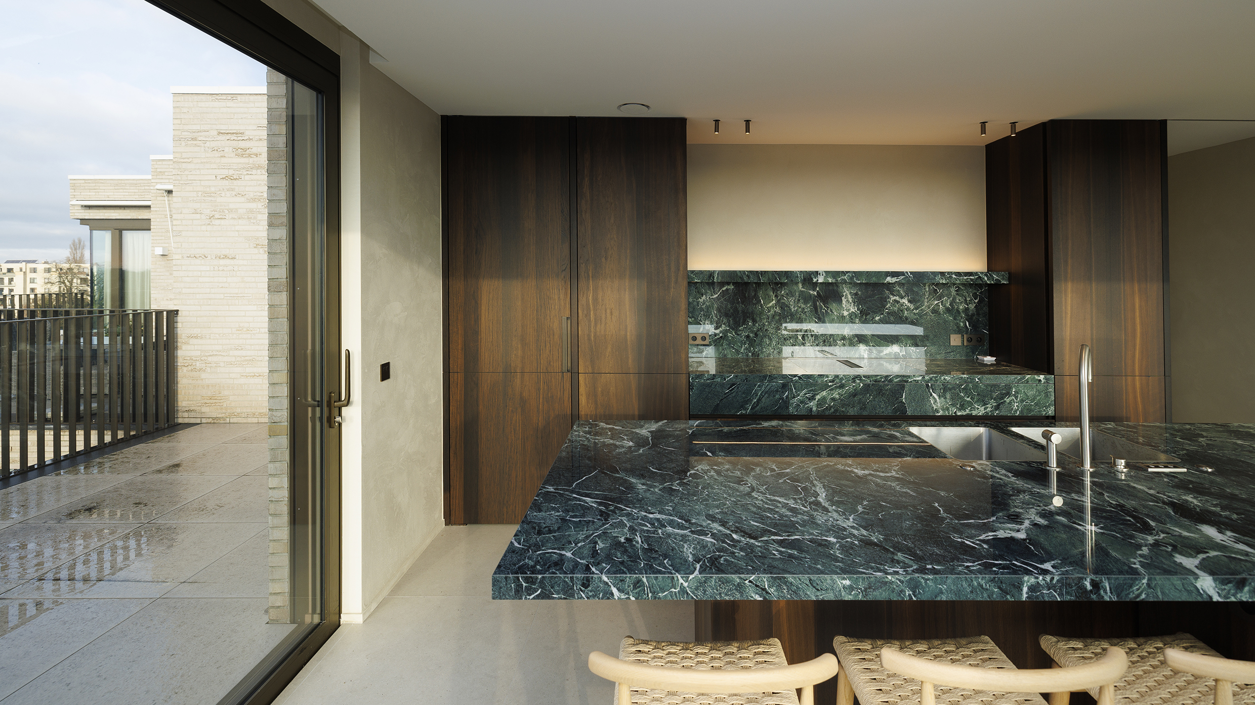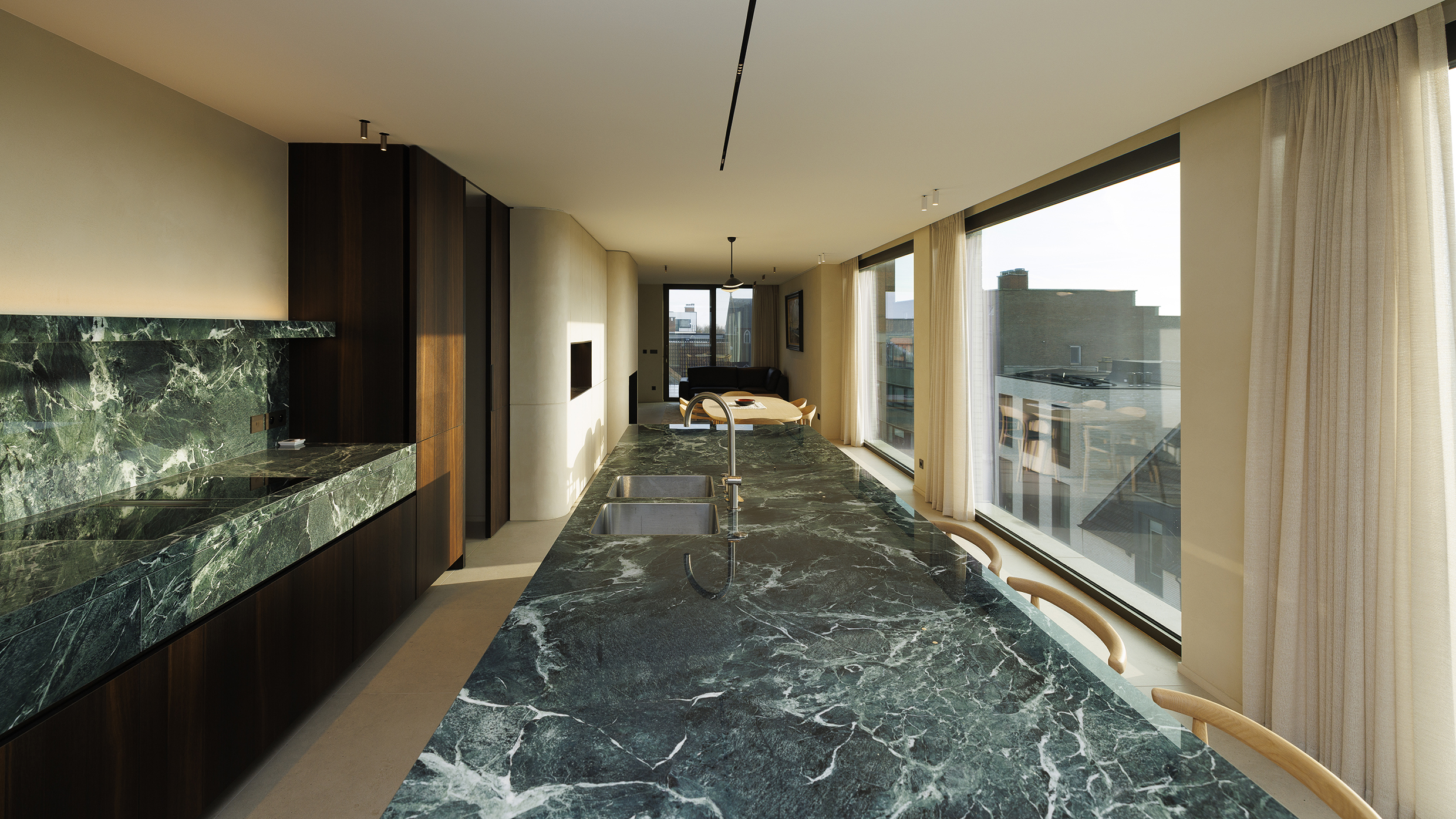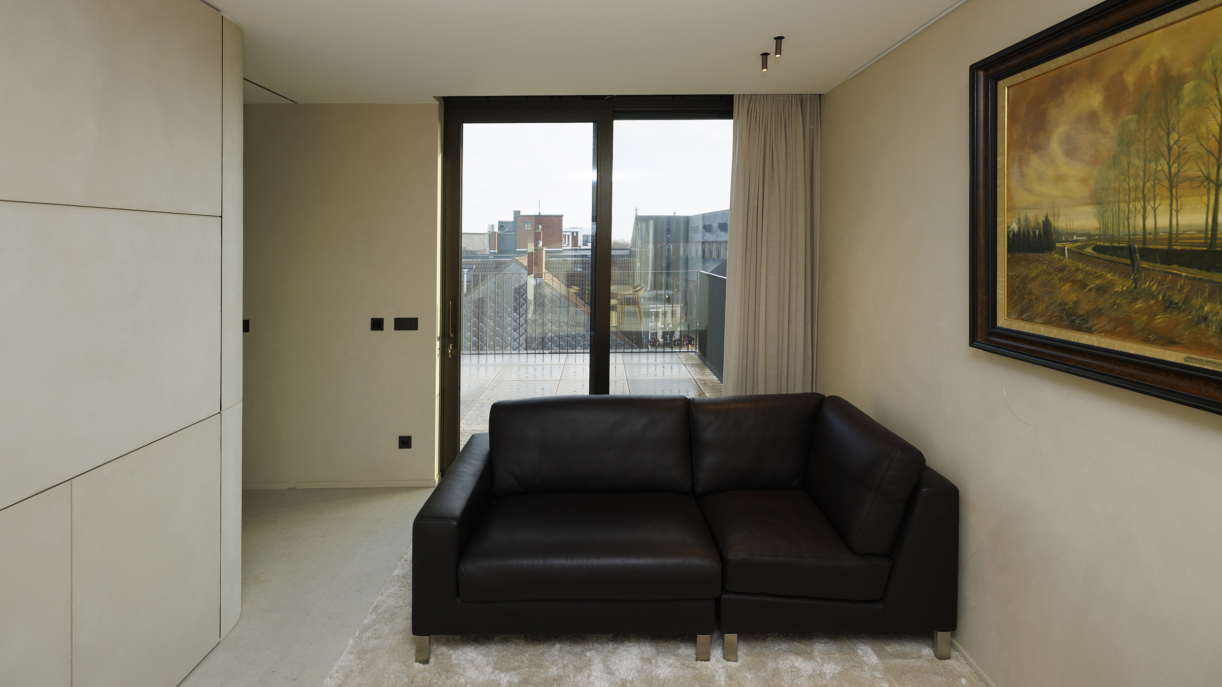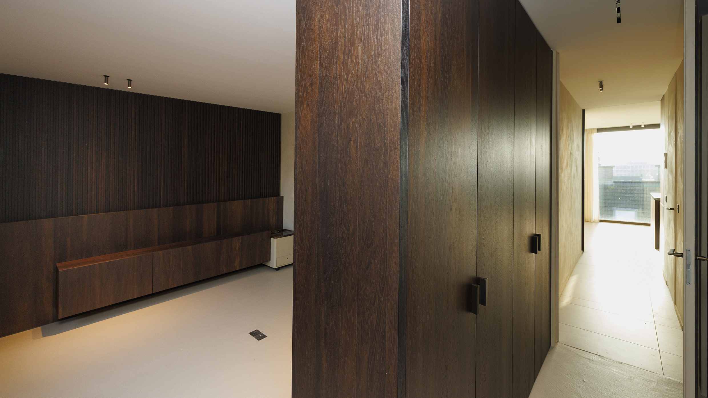 Bij het betreden van het appartement wordt u meteen verwelkomd in de lichtrijke woonkamer, waar ruimte en rust centraal staan. De grote raampartijen, de elegant geïntegreerde houten maatkasten en de design gashaard creëren een warme en verfijnde sfeer. Dankzij de automatische gordijnen met screens geniet u op elk moment van optimaal comfort en privacy.