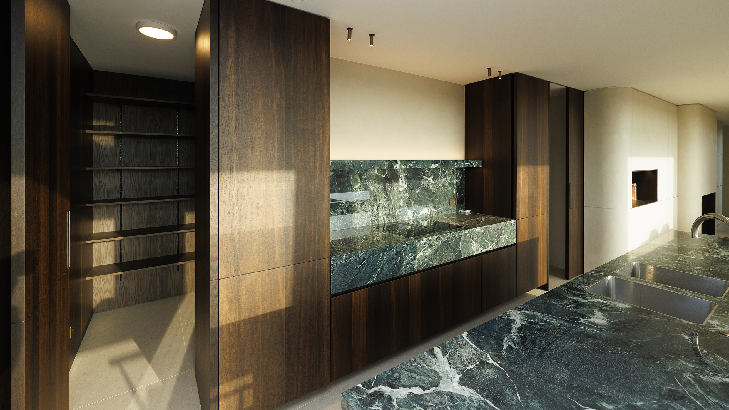 Aansluitend bevindt zich de volledig uitgeruste keuken, voorzien van een Bora-kookplaat met verzonken dampkap, aparte koelkast en diepvries, overvloedige opbergruimte en een praktische aparte berging. Een perfecte combinatie van esthetiek en functionaliteit.